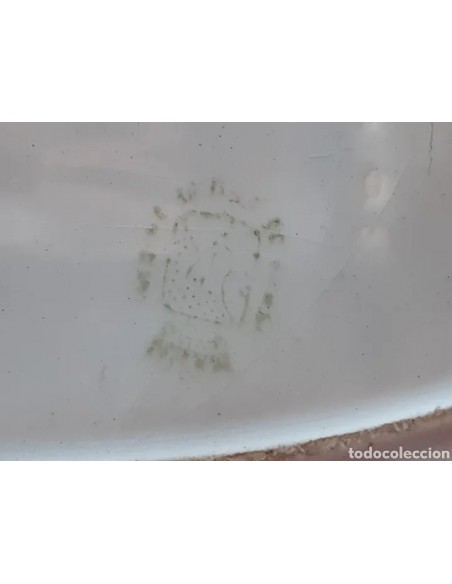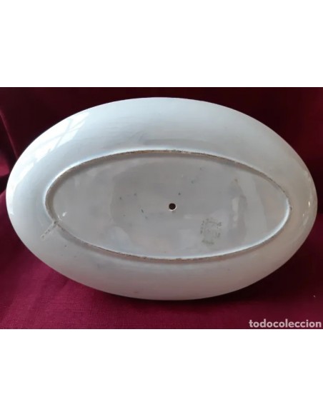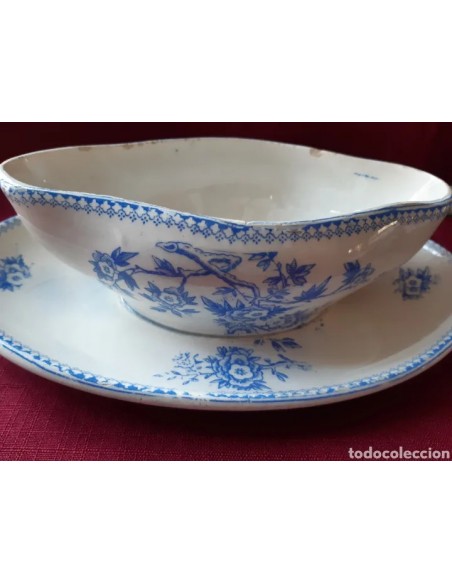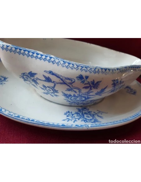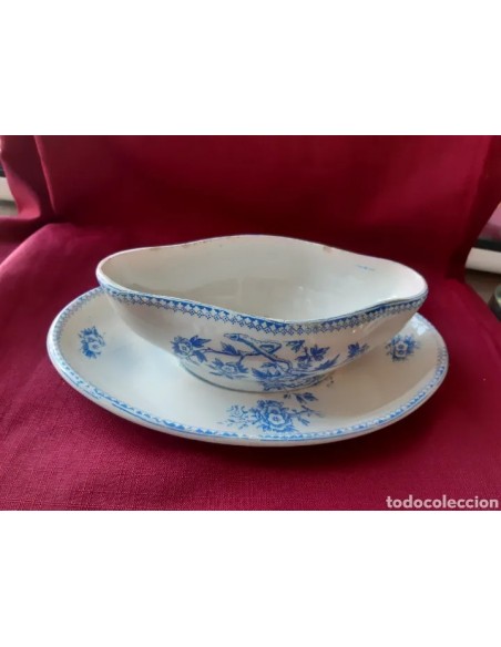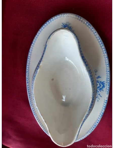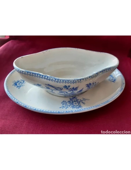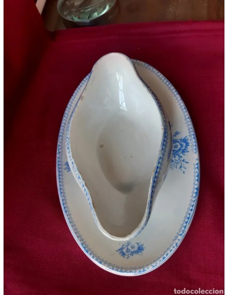 Bonita salsera antigua con portasalsera, francesa. Fuente portasalsera, 26 x 16 cm. Salsera, 19 x 10 x 6 cm.