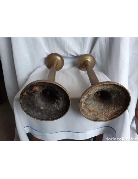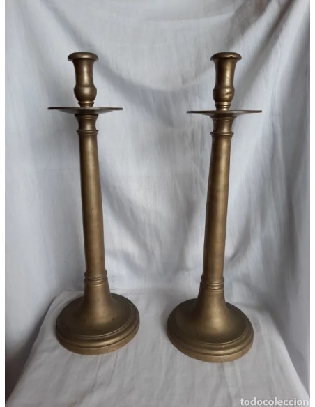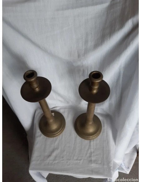 Muy interesante pareja candeleros en bronce, antiguos, siglo XVIII. MEDIDAS: 47 cm alto x 16 cm diámetro base.