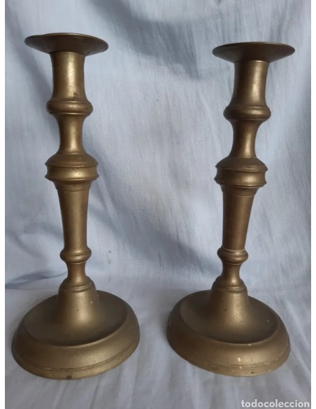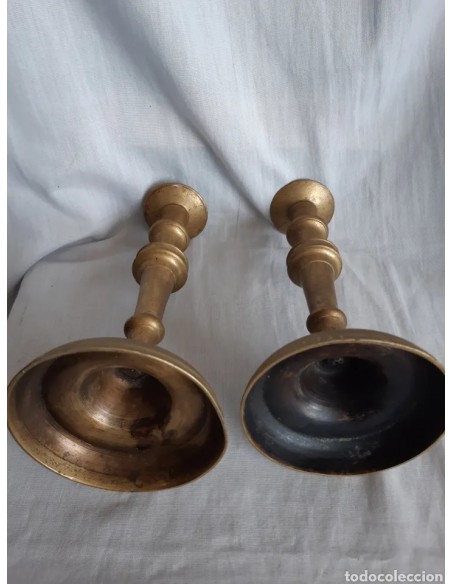 Interesante pareja candeleros en bronce, s. XVIII, base redonda de 12 cm de diámetro y una altura total de 26 cm.