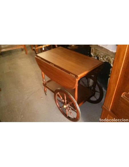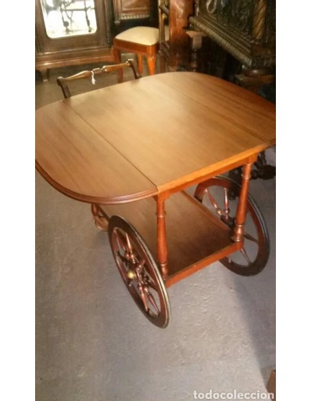 Bonita camarera, años 60, en buen estado, restaurada y apta para utilizar. Mesa cerrada 41 x 73 cm. Mesa abierta, ovalada, 87 x 73 cm Altura, 71 cm. Ruedas diámetro 46 cm Madera tipo sapeli.