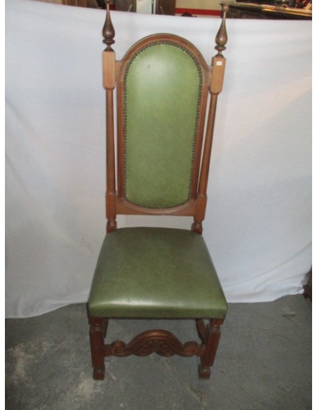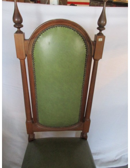Antigua silla en madera de nogal, tapizado con cuero verde.