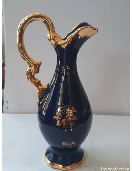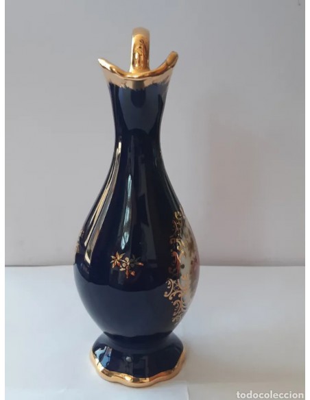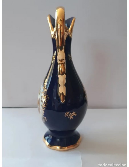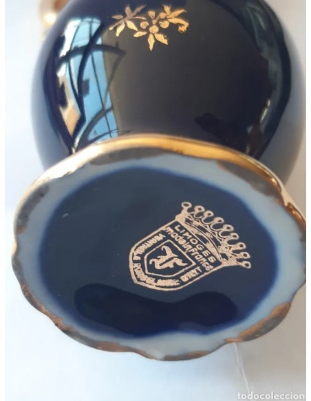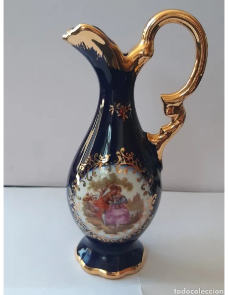 Bonita jarra en miniatura de Limoges color azul cobalto con detalles en dorado. Gran escena romántica. Medidas máximas: Alto, en asa, 14 cm. Diámetro base 4 cm.