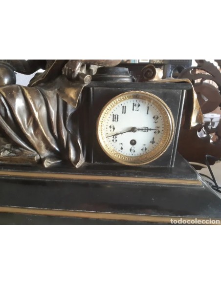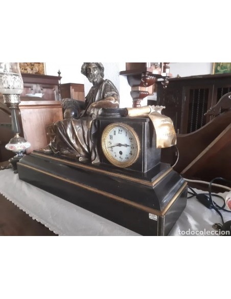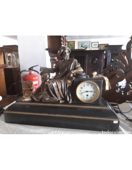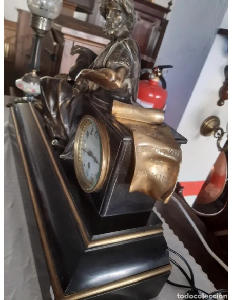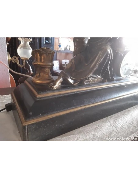 Bonito reloj de sobremesa con figura en bronce, antiguo, completo y funcionando. Medidas: 60 x 18 x 42 cm.Siglo XIX