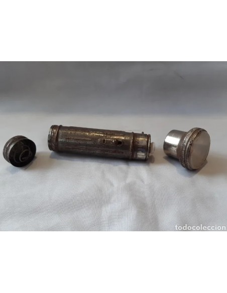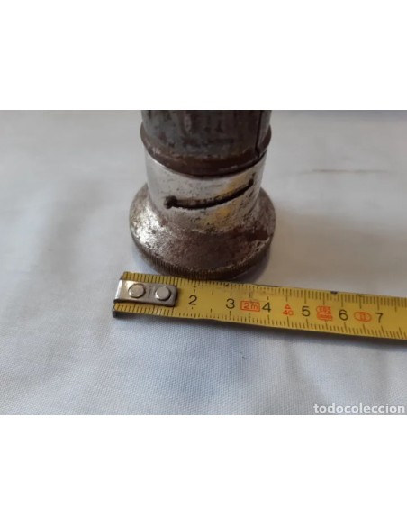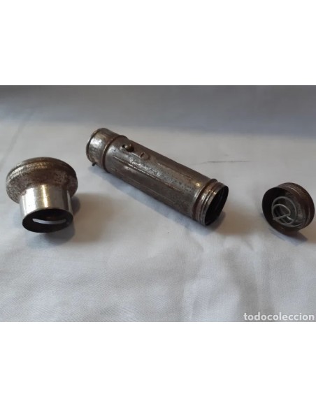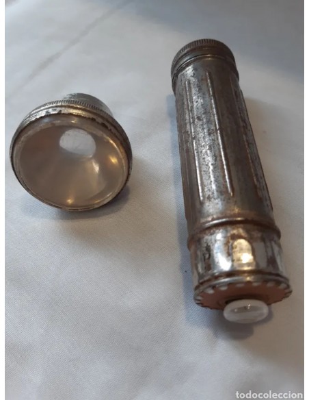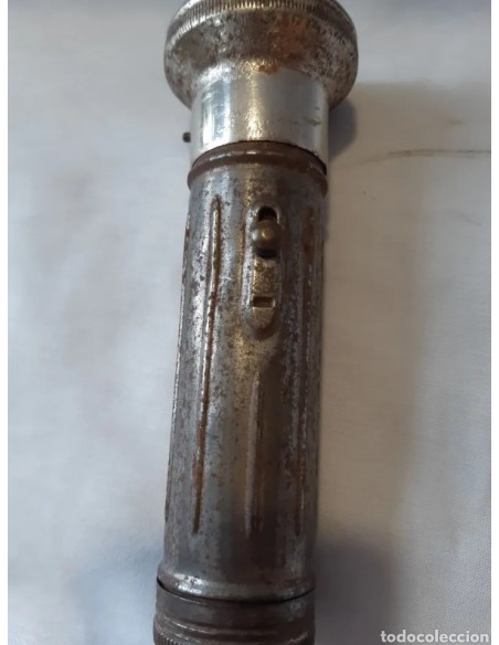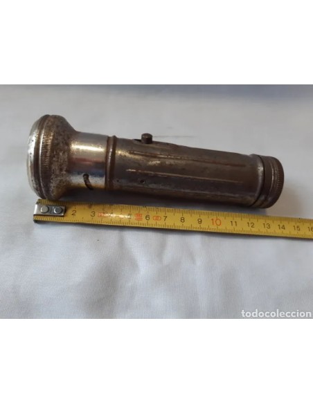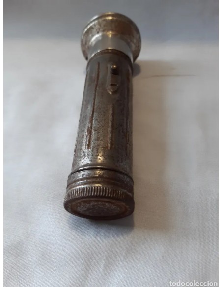 Usada, completa, señales de óxido propias del paso de los años. Linterna de pilas redondas. Mediados siglo XX. Medidas en fotos.
