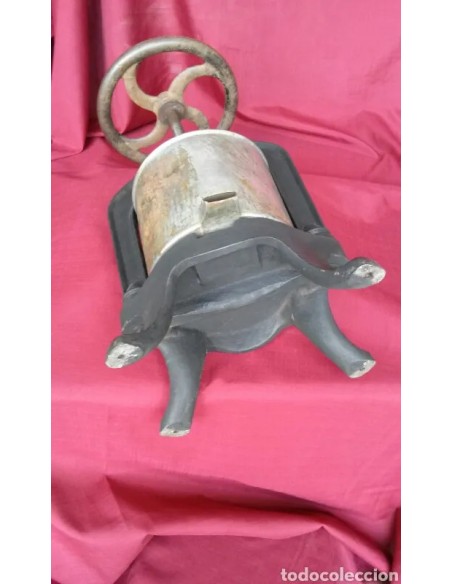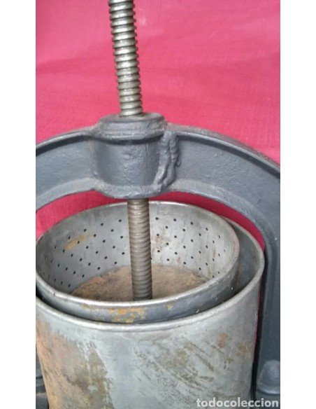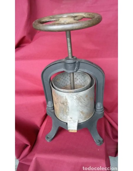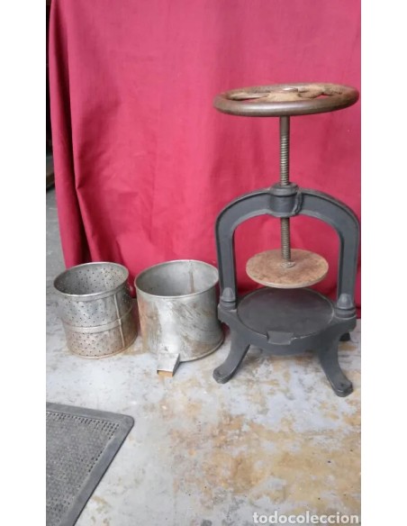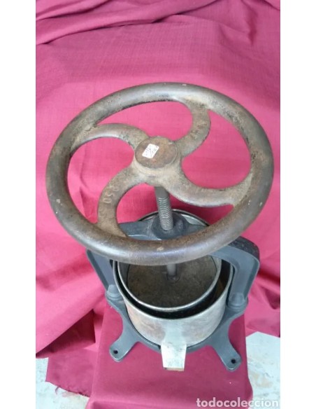Prensa de fundición para fruta y similares. Estado normal de conservación. En las fotos se puede apreciar una soldadura hecha en uno de los brazos. La prensa funciona correctamente. Medidas: diámetro volante, 25 cm. Base 29 x 21 cm. Altura hasta base tornillo, 41 cm. Tornillo y volante, 34 cm.