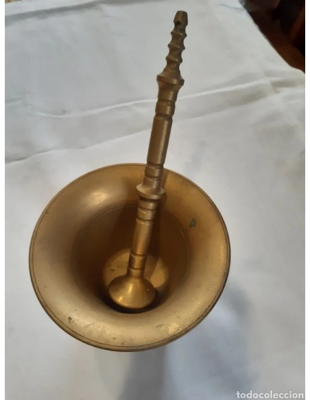 Antiguo almirez, mortero, en bronce. Buen estado. Medidas: diámetro boca 13 cm. Diámetro base 7,5 cm. Altura 9 cm. Longitud mano 21,5 cm.