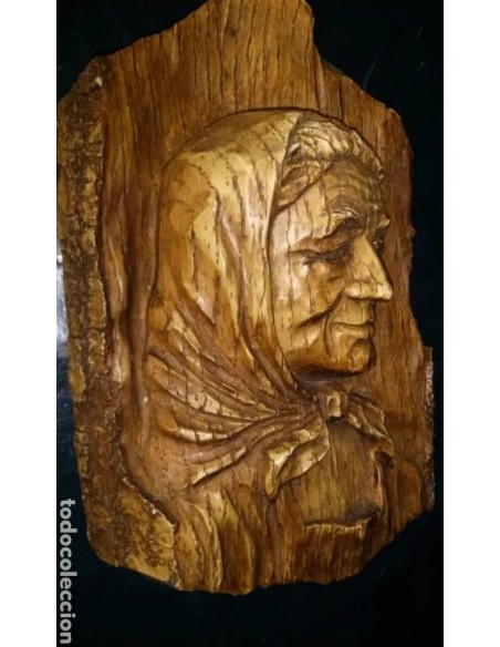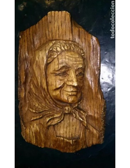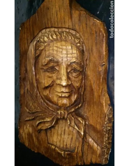 Bonita talla en madera maciza representando a una señora mayor, campesina de la tercera edad.Medidas: 18,5x12,5x4 cm.En buen estado.
