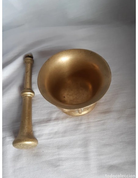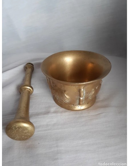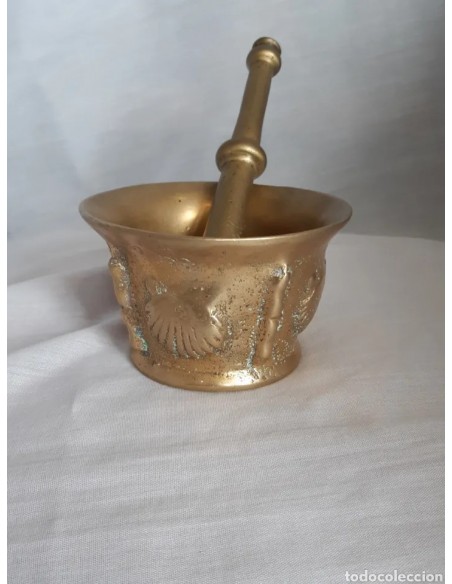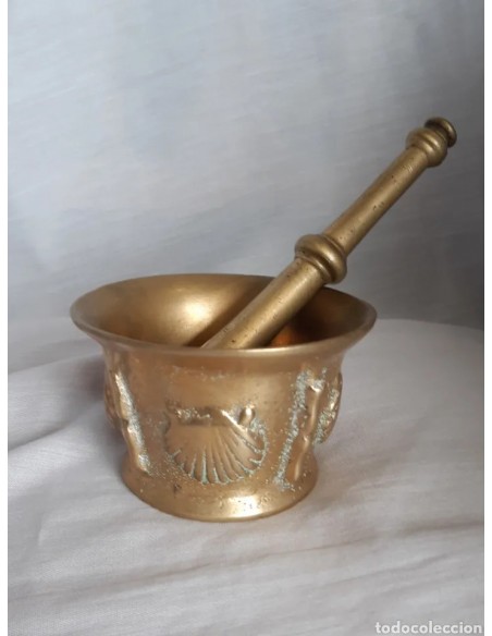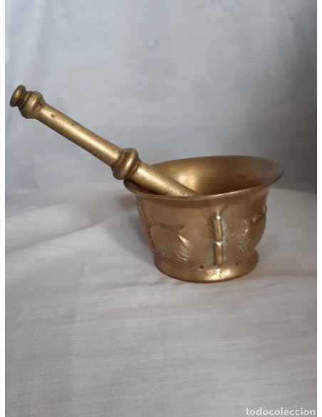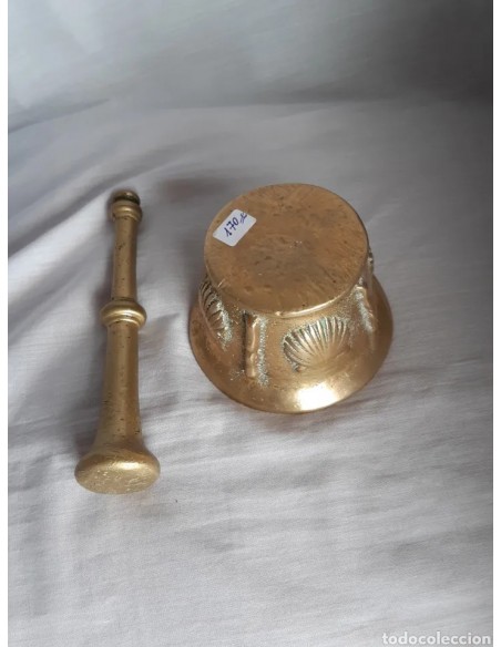 Excepcional mortero, almirez, en bronce, siglo XVIII, de 4 conchas y 4 costillas. Diámetro base 7 cm. Diámetro boca 10,5 cm. Altura 6,5 cm. Mano 16,5 cm.